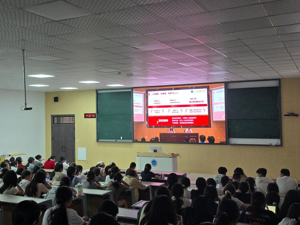 10月11日下午,浙江药科职业大学奉化校区111会议室座无隙地,校党委书记阮叶萍以《药路起航笃行逐梦》为题,为2025级新生上了一堂内涵丰富的“开学第一课”,100余名师生在会场共同聆听。校党委副书记沈黎新主持。