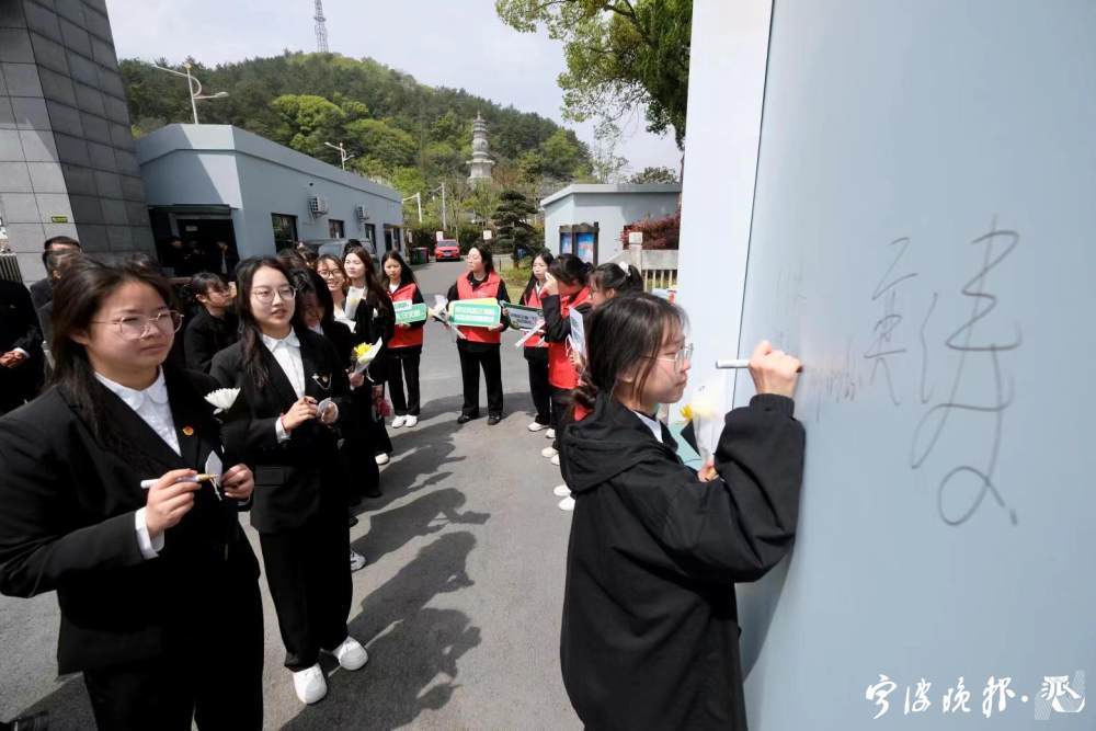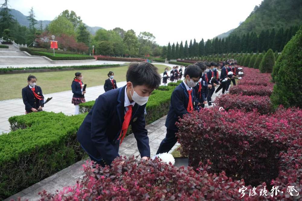 “此时此刻,我们在这里隆重集会,沉痛悼念为了今天的幸福生活而英勇捐躯的革命英雄……”4月3日上午,奉化区烈士陵园也迎来了一批青年学生。