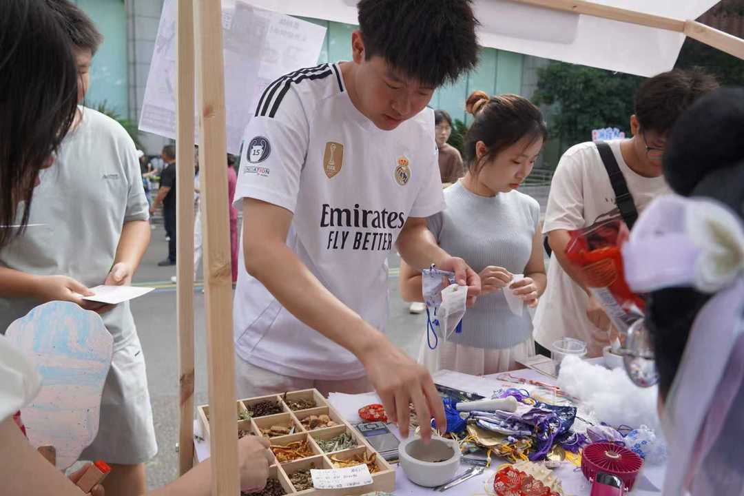 在“浙药植韵•本草伴生实践区”,新生们巧手翻飞:桑皮纸裹住艾绒,卷制出温经散寒的传统艾条;山楂片、莲子、薏苡仁在彩绳穿梭间,变身寓意“好运连连”“连中三元”“仁心仁术”的祈福手串;艾叶、藿香等药材在巧思调配下,化作一枚枚驱蚊安神的专属香囊。“浙药工坊•匠艺传习体验区”则弥漫着匠艺的芬芳:UV胶将杭白菊、薄荷定格成晶莹剔透的草药书签,拓印锤敲击下,紫苏叶、薄荷芽在帆布包上绽放出自然的永恒纹样,引得新生纷纷举起“把健康背在身上”的创意作品合影留念。