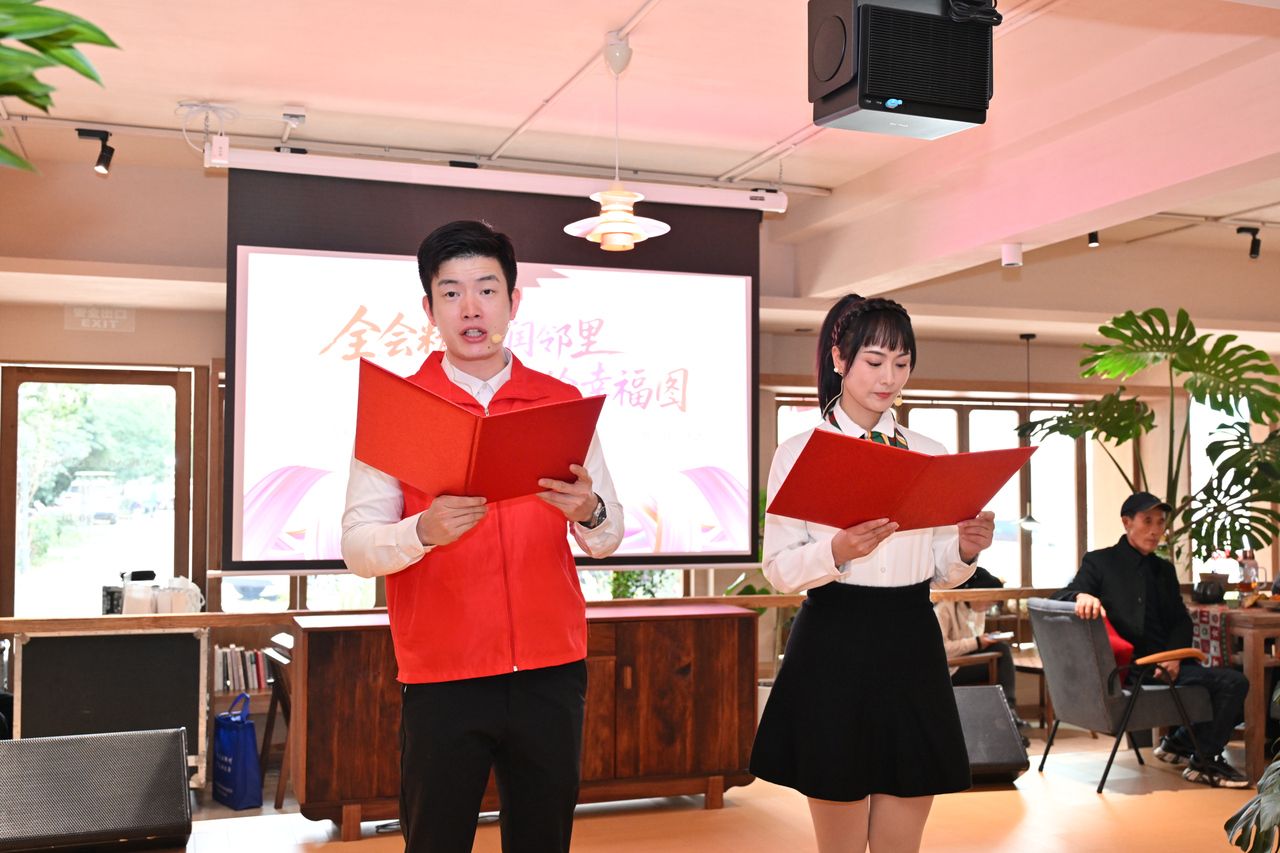活动在《暖街新韵时代和声》主题朗诵中拉开序幕,铿锵有力的词句,传递出学习贯彻全会精神的坚定决心,迅速凝聚了现场人心。随后,青年社工马泽幸带来《政策黑科技双BUFF:锦苑养老燃到起飞》主题宣讲。她以“养老焦虑”网络热词切入,用风趣的种草式语言,生动解读“十五五”规划中养老服务的品质发展方向,并分享了锦苑社区智慧食堂、共富工坊、AI守护系统等鲜活案例,描绘出一幅政策与科技赋能下的幸福养老新图景,引发了在场居民,特别是老年朋友的强烈兴趣与共鸣。