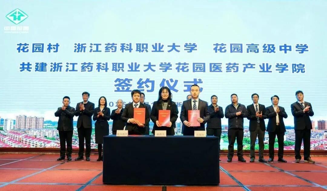 在与会嘉宾的共同见证下,浙江药科职业大学药学院院长胡英与花园村党委书记邵鸿轩、东阳花园高级中学校长何静霞共同签署合作共建协议。姜宇国与邵钦祥共同为“浙江药科职业大学花园医药产业学院”揭牌。