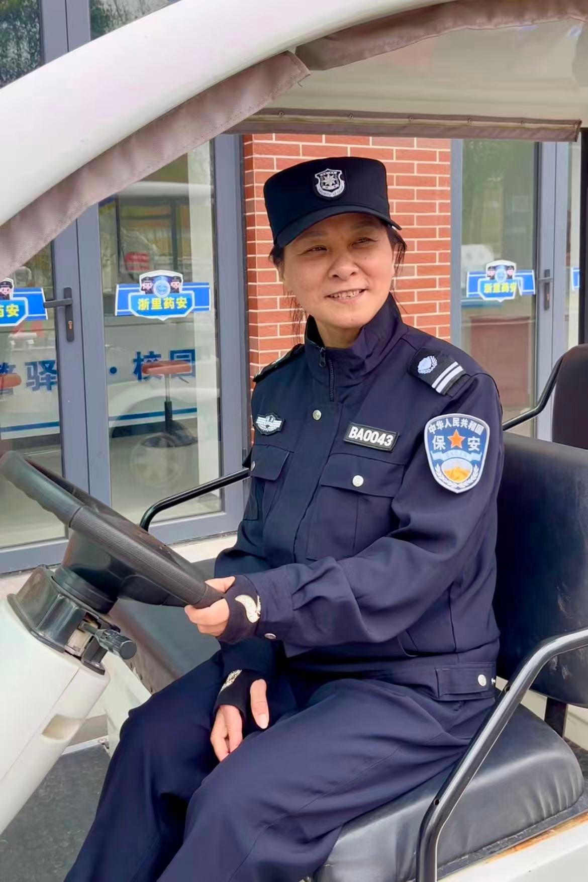 “同学,头盔戴好,不要带人哦。”浙江药科职业大学的校园里,李亚辉开着巡逻车,不时提醒身边骑电动车的同学们。她说话时笑眯眯的,语气里有一种长辈的关切,也有严肃与认真。