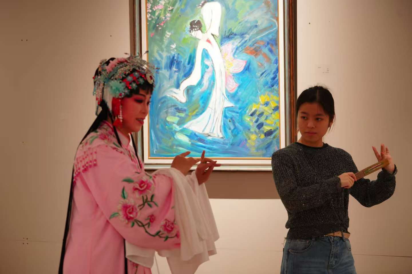活动现场同步亮相“人生有戏 值得来”戏曲主题艺术展,笔墨勾勒间戏韵流转,尽显戏入画作、画中生情的东方艺术意境。师生现场观摩交流、同台互动体验。